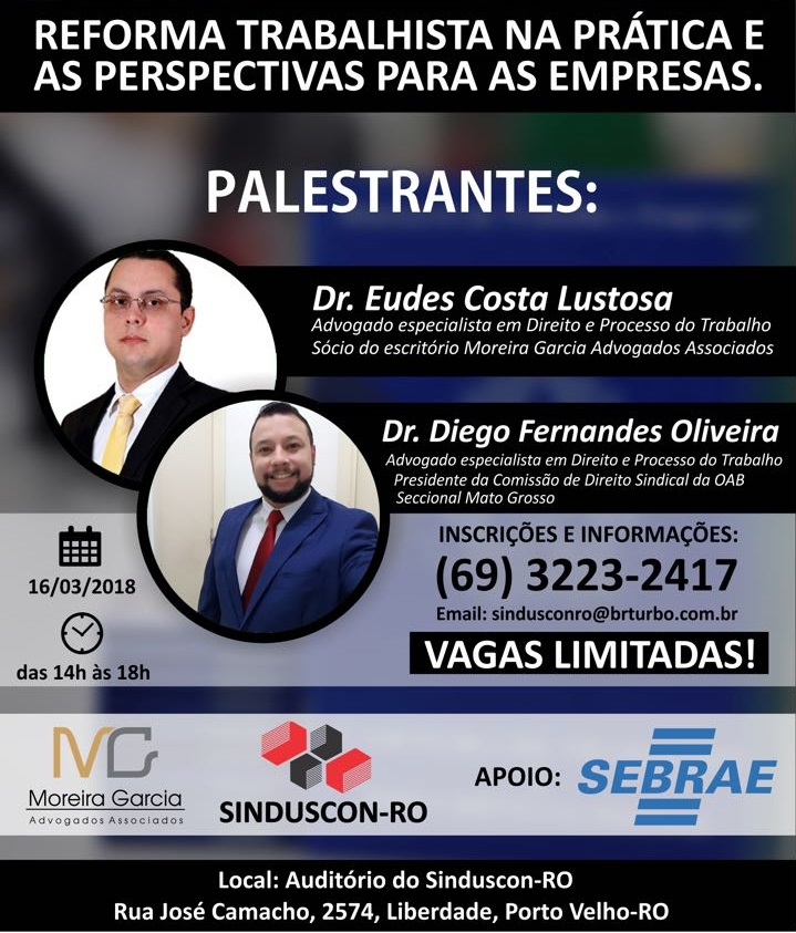 Diante desta realidade o Sindicato da Indústria da Construção Civil (SINDUSCON/RO), em parceria com o escritório Moreira Garcia Advogados Associados, realizarão no dia 16 de março de 2018, das 14hs às 18hs no auditório do SINDUSCON/RO em Porto Velho, a palestra com o tema: Reforma Trabalhista na Prática e as Perspectivas para as Empresas. A palestra tem como objetivo expor os aspectos que foram alterados em razão da chamada Reforma Trabalhista.